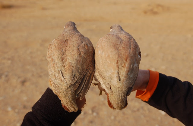 We waited, but the birds seem to sleep it out late during the cold mourning, the first birds to arrive were a flock of 15 Sand Partridges, we soon flushed them into the nets, which we set in V formation at the narrowest chokepoint of the wadi and we caught two beautiful males (new ringing species for us).